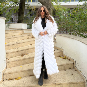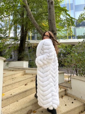 Haină lungă din blană naturală de vulpe polară, cu volum bogat și textură densă, atent selecționată pentru un aspect spectaculos și elegant. Designul cu rânduri în formă de V și rever amplu alungește vizual silueta și oferă un aer sofisticat, în timp ce finisajul mătăsos asigură confort termic superior. O piesă statement, ideală pentru apariții de lux și ținute rafinate în sezonul rece.
