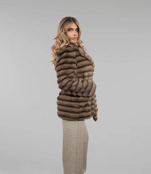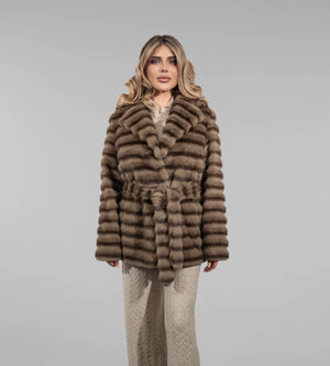 Un model sofisticat, realizat din alcantara de calitate superioară, plăcută la atingere și rezistentă, completată de blană naturală de vizon fin tuns, cu un aspect elegant și uniform. Designul cu cordon în talie evidențiază silueta și oferă un plus de feminitate, iar textura bogată a blănii conferă rafinament și confort termic ridicat. Ideal pentru ținute elegante de zi sau seară, acest palton îmbină luxul autentic cu stilul modern și atemporal.