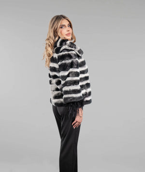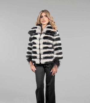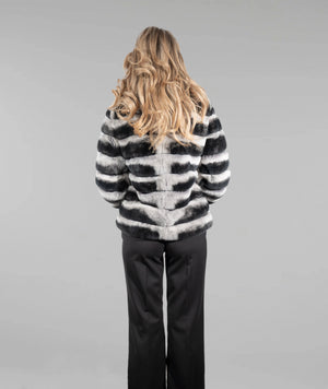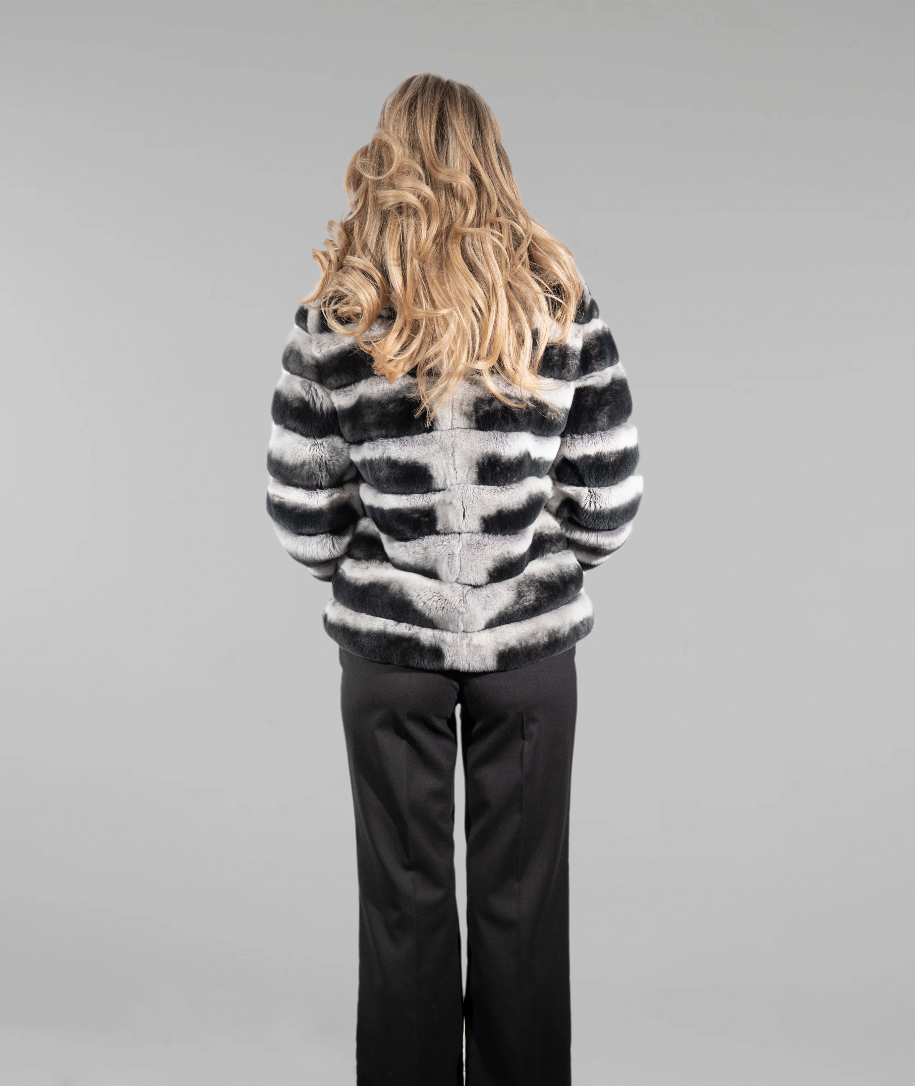 Haină din blană naturală de chinchilla rex, apreciată pentru finețea excepțională și atingerea catifelată, cu un design modern realizat în rânduri orizontale ce oferă volum echilibrat și un aspect sofisticat. Contrastul elegant dintre nuanțele de gri deschis și negru evidențiază structura blănii și conferă un aer rafinat și contemporan. Gulerul amplu completează armonios silueta, iar terminațiile cu detalii fine adaugă un plus de feminitate și exclusivitate. O piesă statement, ideală pentru ținute elegante de zi sau apariții speciale de seară.