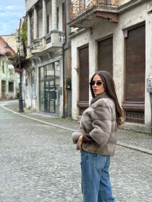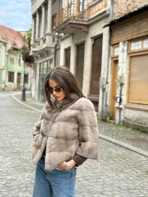 Haină din blană naturală de vizon gri safir, cu nuanță elegantă și luciu discret, atent selecționată pentru un aspect rafinat și modern. Croiala curată, cu rânduri uniforme, oferă un echilibru perfect între confort și stil, evidențiind delicat silueta. Textura fină și densitatea blănii asigură un confort termic superior, transformând această piesă într-o alegere ideală pentru ținute urbane sofisticate și apariții elegante în sezonul rece.