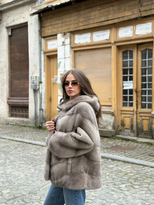 Haină din Blană Naturală de Vizon Gri Safir cu Gluga