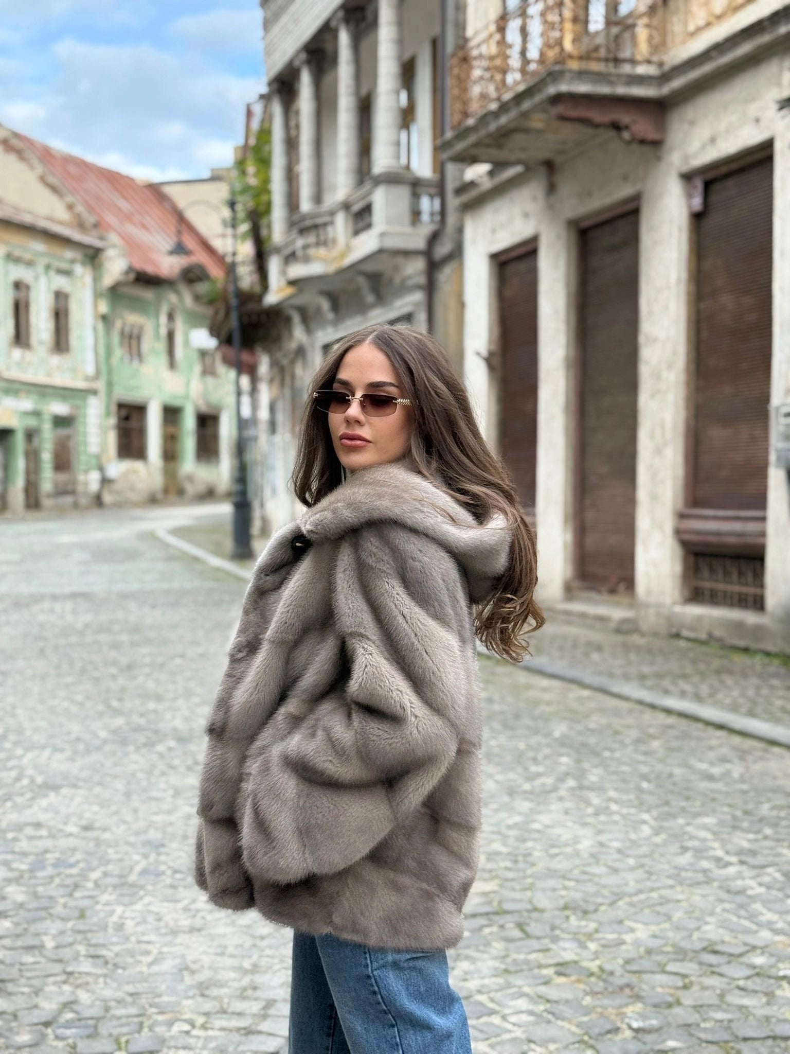 Haină din blană naturală de vizon gri safir, cu textură fină și luciu delicat, atent selecționată pentru un aspect elegant și sofisticat. Gluga generoasă îmbrăcată în blană naturală adaugă un plus de rafinament și confort termic, în timp ce croiala modernă și proporțiile echilibrate evidențiază armonios silueta. O piesă exclusivistă, ideală pentru ținute urbane de lux și apariții rafinate în sezonul rece.