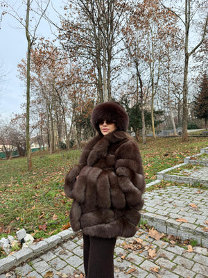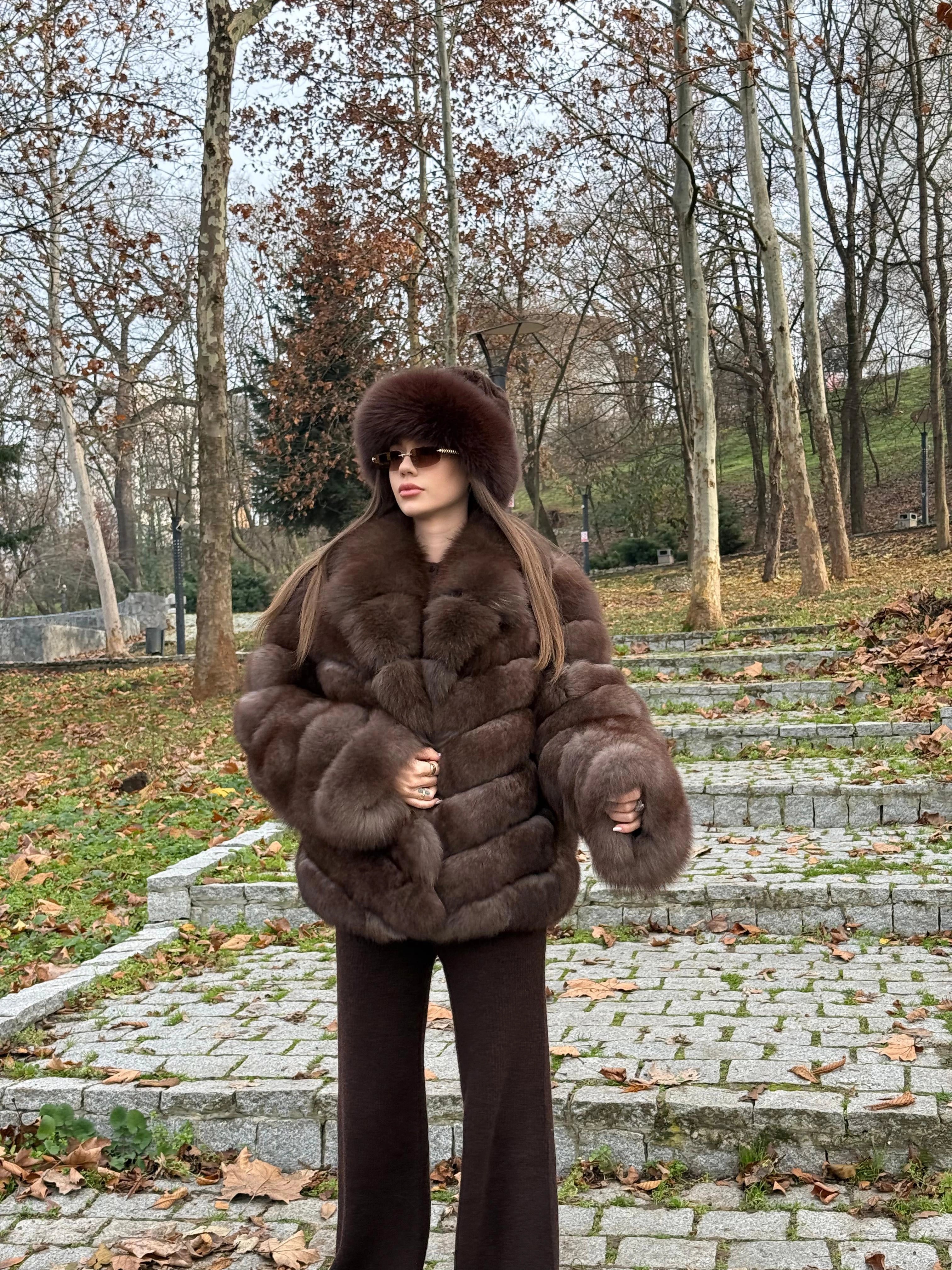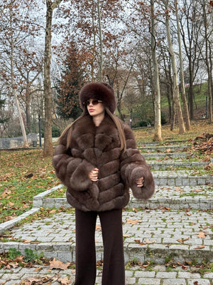 Blană naturală de vulpe polară, cu volum generos și textură extrem de densă, atent selecționată pentru un aspect elegant și sofisticat. Designul clasic cu rânduri bine definite și rever amplu oferă un plus de rafinament și evidențiază armonios silueta, în timp ce finisajul mătăsos asigură confort termic superior. Piesa este completată de o căciulă asortată din blană naturală, pentru un look exclusivist și apariții statement în sezonul rece.